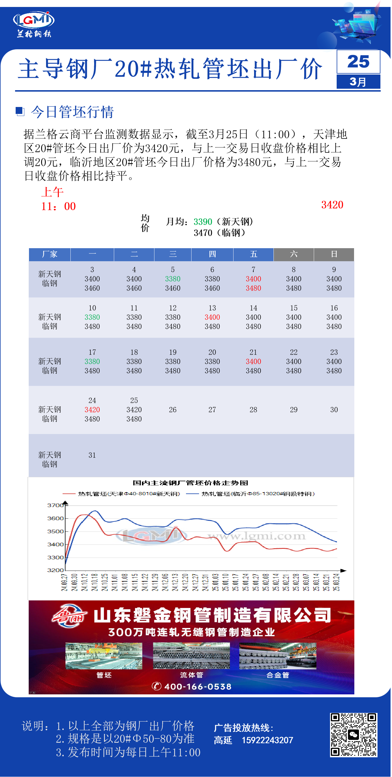 • 3月25日主导钢厂20#热轧管坯出厂价(11:00)