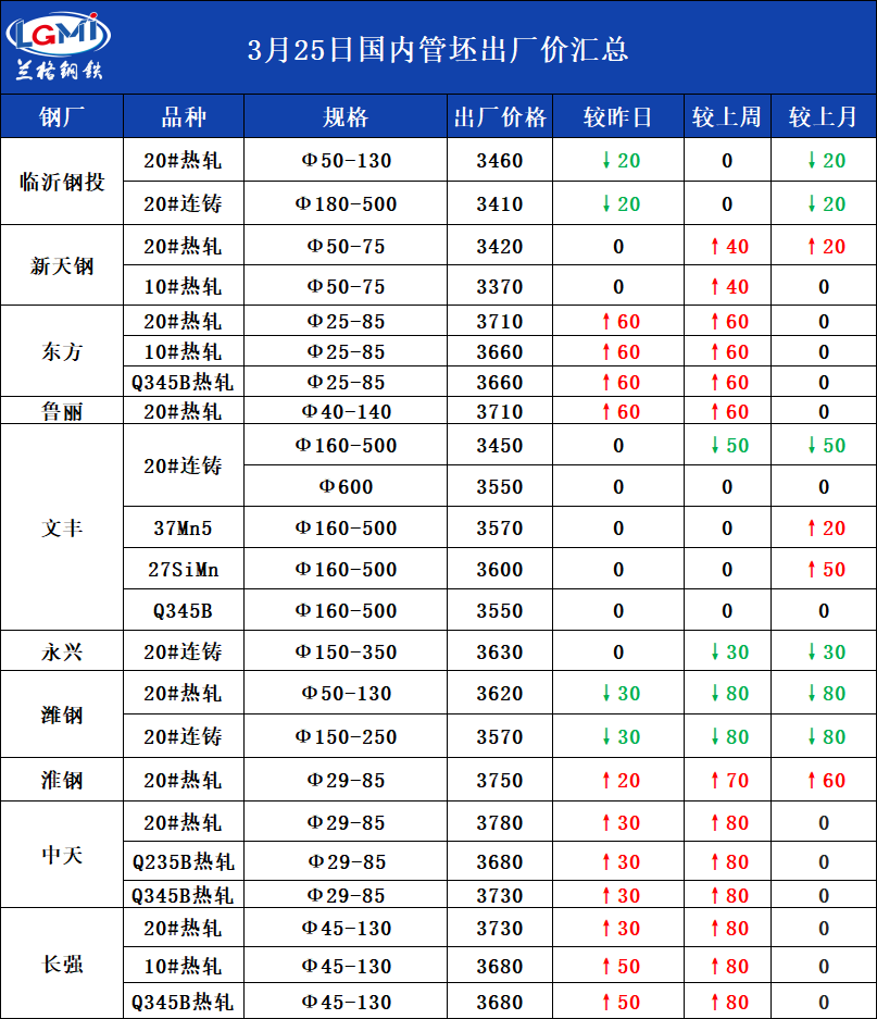 • 3月25日主导钢厂20#热轧管坯出厂价(11:00)