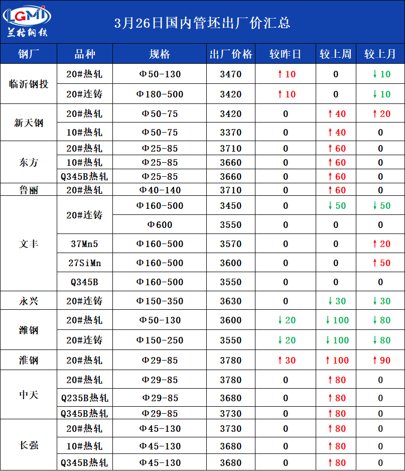 • 3月26日主导钢厂20#热轧管坯出厂价(11:00)