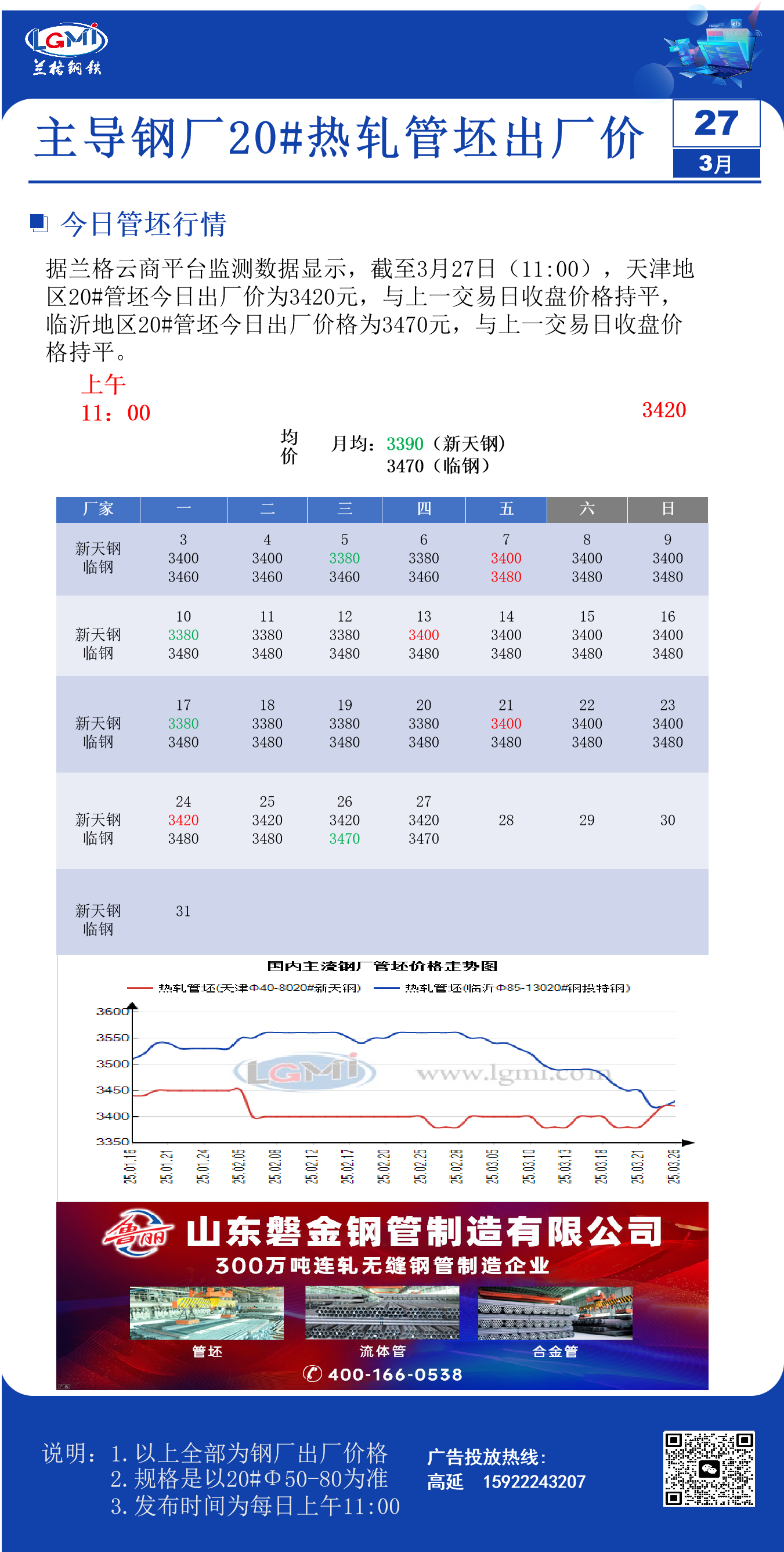 • 3月27日主导钢厂20#热轧管坯出厂价(11:00)