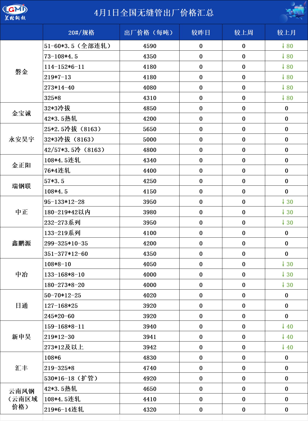 • 4月1日主导钢厂20#热轧管坯出厂价(11:00)