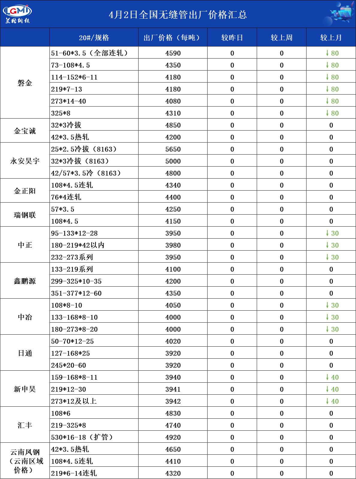 • 4月2日主导钢厂20#热轧管坯出厂价(11:00)