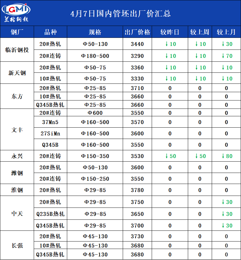 • 4月7日主导钢厂20#热轧管坯出厂价(11:00)