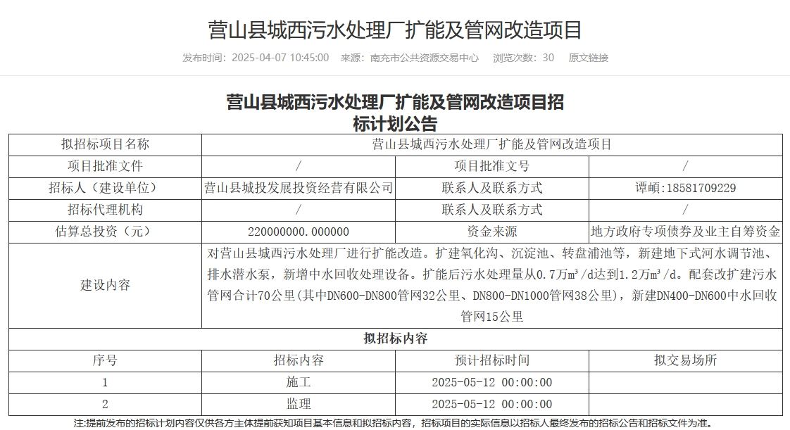 4月7日,四川省营山县城西污水处理厂扩能及管网改造项目招标计划公告。