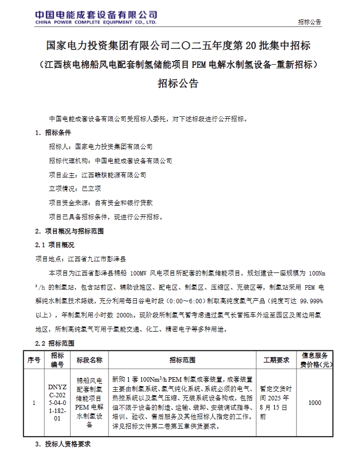 4月7日,国家电力投资集团有限公司发布2025年度第20批集中招标公告,针对江西核电棉船风电配套制氢储能项目中的PEM电解水制氢项目进行重新招标,投标截止时间为4月28日。