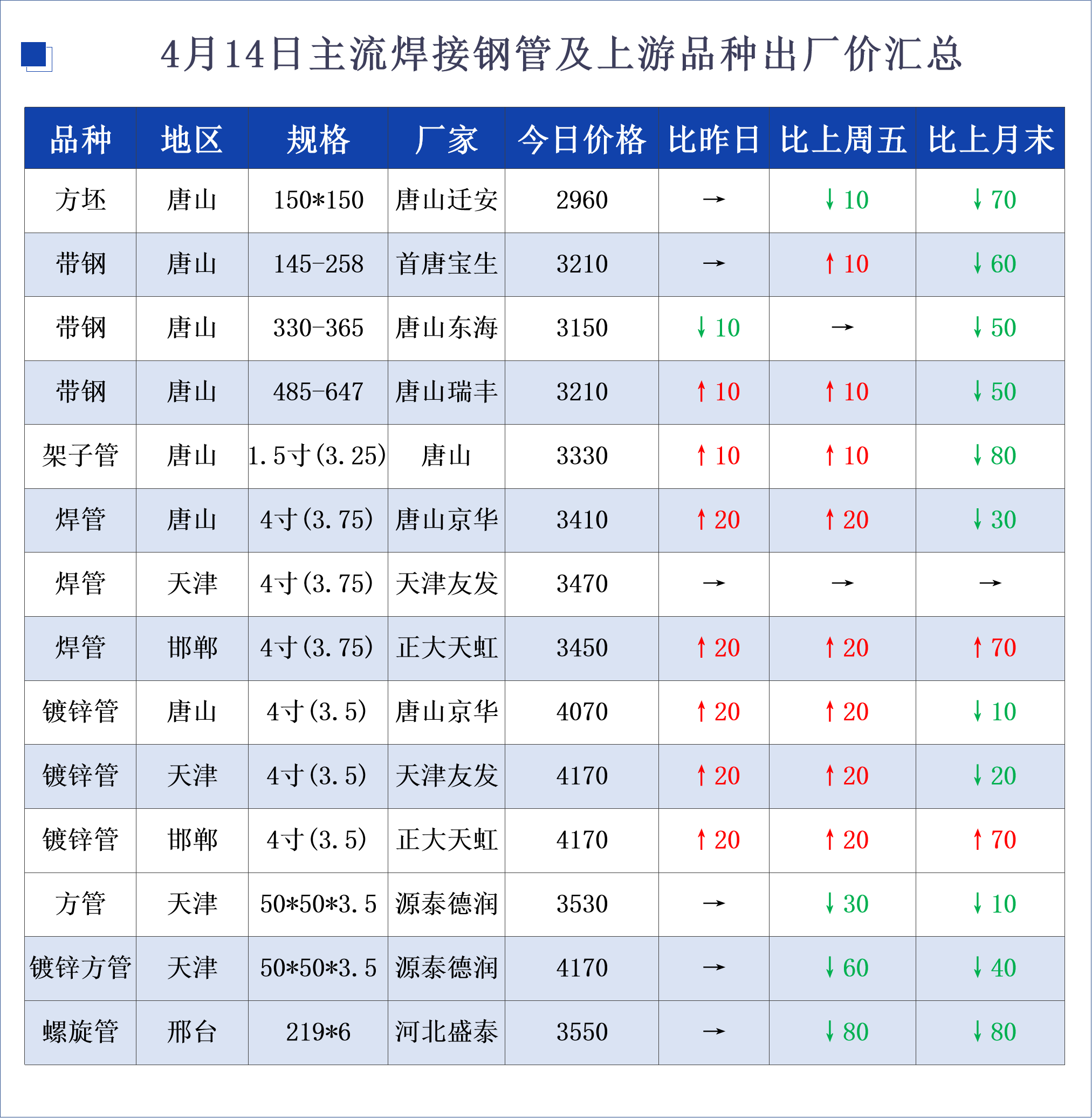 • 4月14日主流焊接钢管及上游品种出厂价汇总