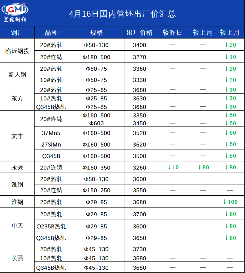 4月16日国内管坯出厂价汇总
