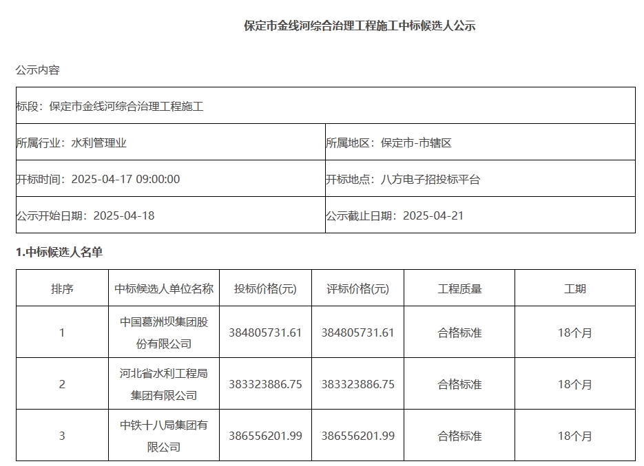 4月18日,河北保定市金线河综合治理工程施工中标候选人公示。