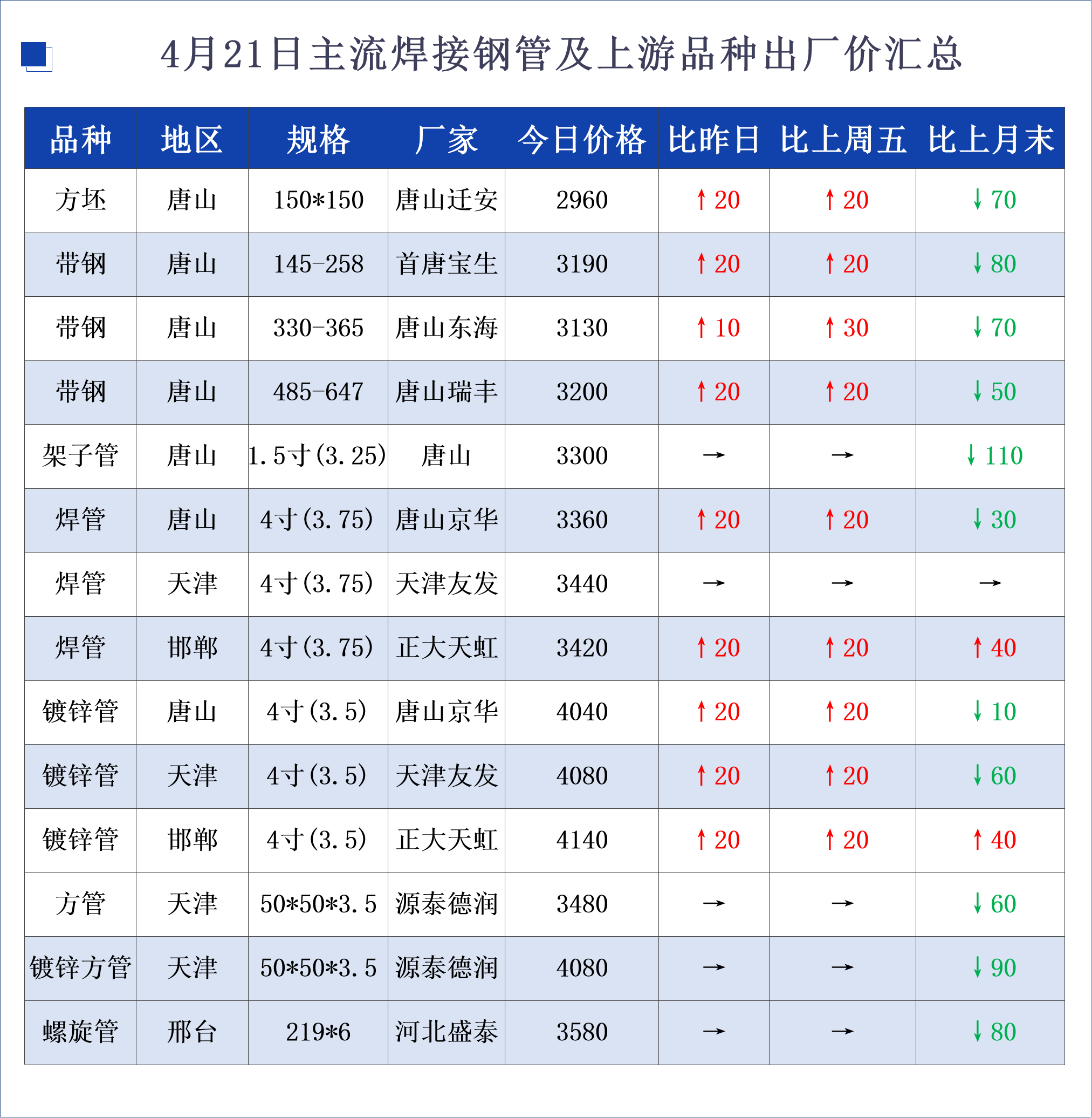 • 4月21日主流焊接钢管及上游品种出厂价汇总