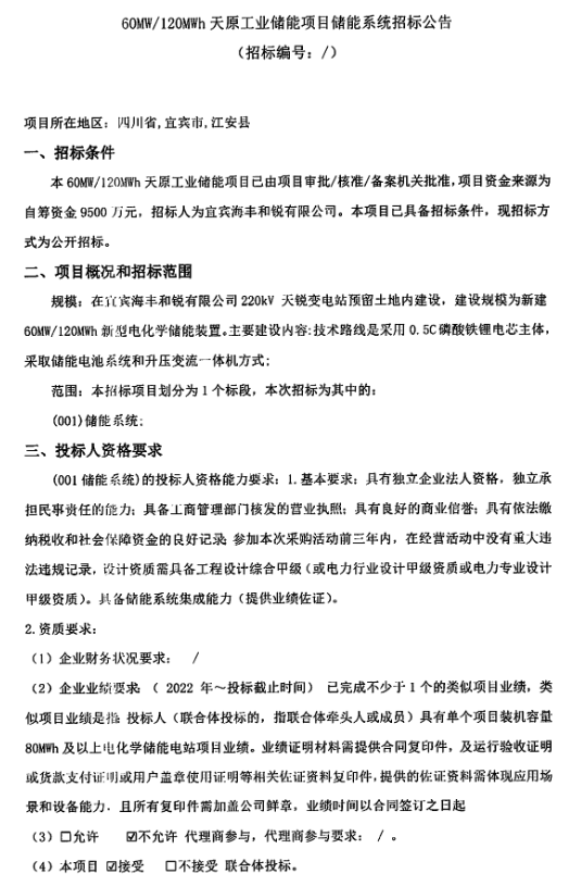 4月21日,四川省宜宾市60MW/120MWh天原工业储能项目储能系统招标公告发布。项目资金来源为自筹资金9500万元,折合单价约0.7917元/Wh,招标人为宜宾海丰和锐有限公司,主要从事化学原料和化学制品制造。