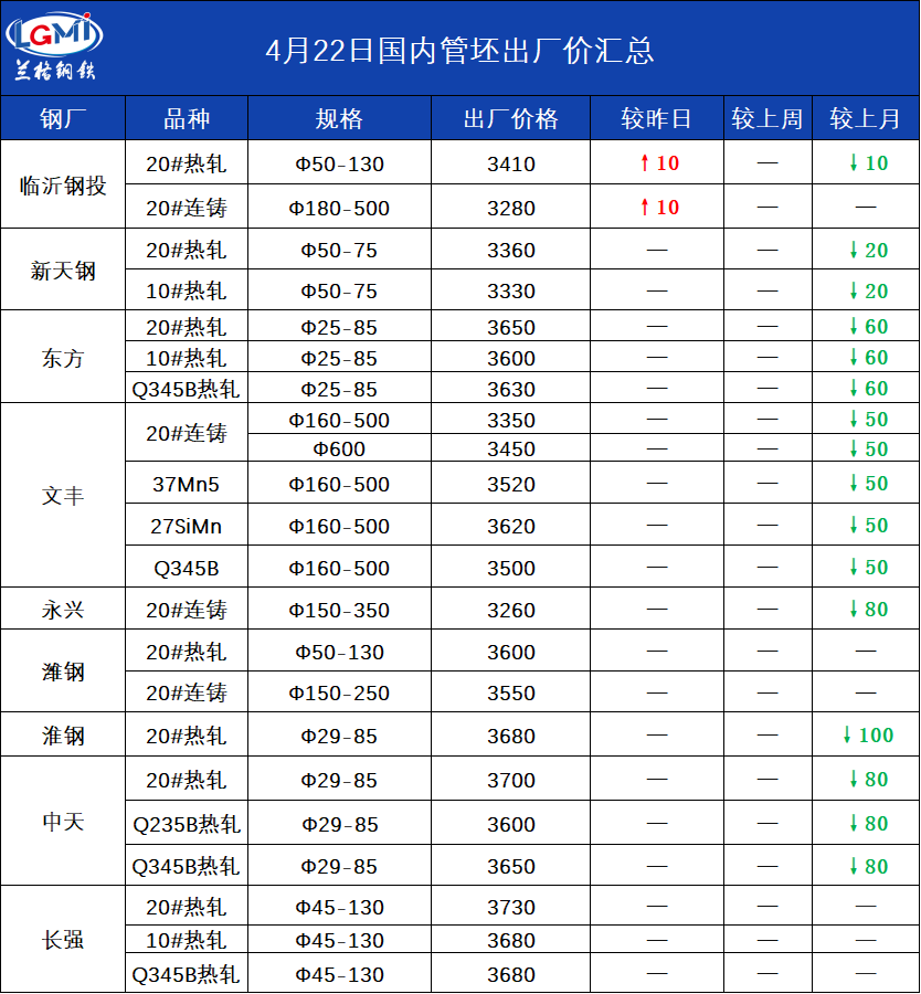 • 4月22日主导钢厂20#热轧管坯出厂价(11:00)