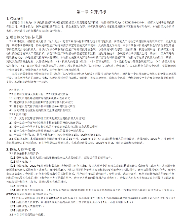4月19日,国华投资氢能厂站AI智能巡检机器人研发服务公开招标项目招标公告,该项目不接受联合体投标。根据招标公告,随着工业自动化和智能化技术的飞速发展,传统的人工巡检方式逐渐暴露出效率低下、安全风险高、数据不准确等问题。特别是在氢能厂站这种需要频繁巡检的复杂环境中,此类问题尤为突出。