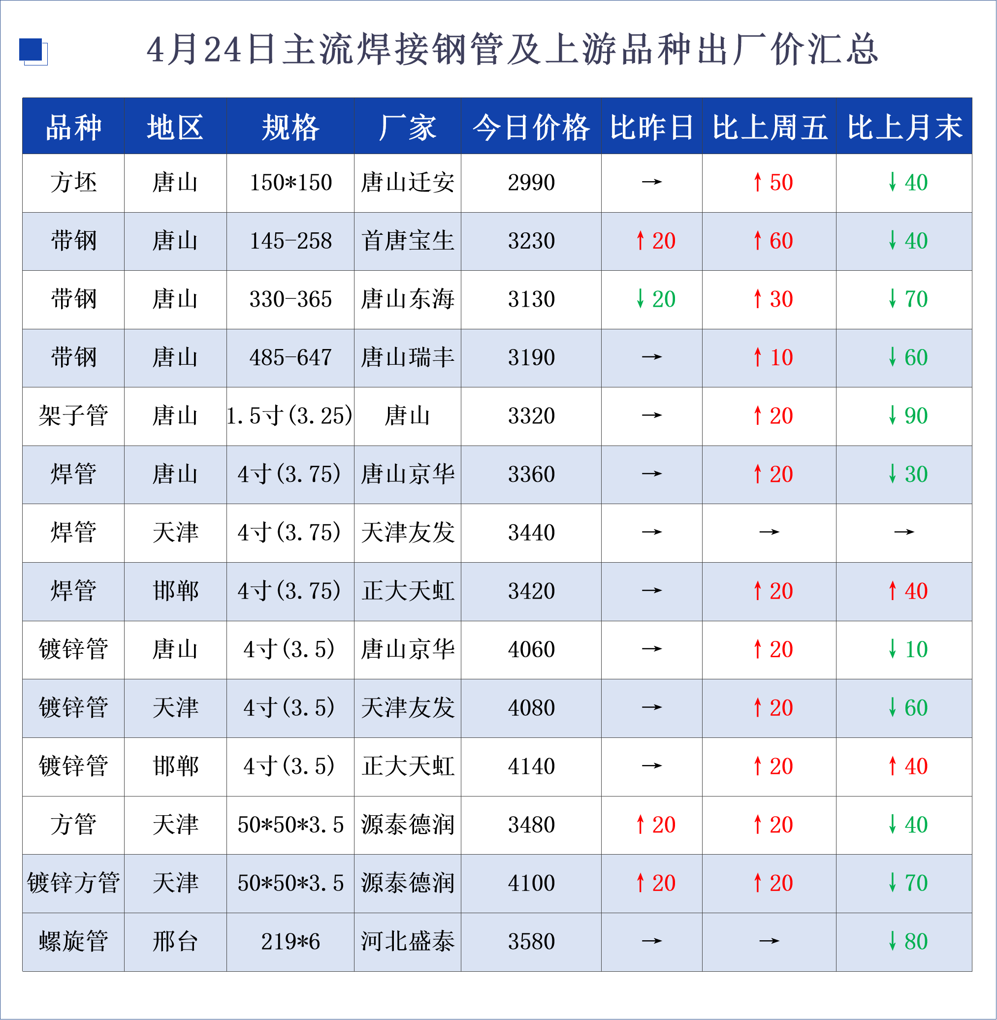 • 4月24日主流焊接钢管及上游品种出厂价汇总