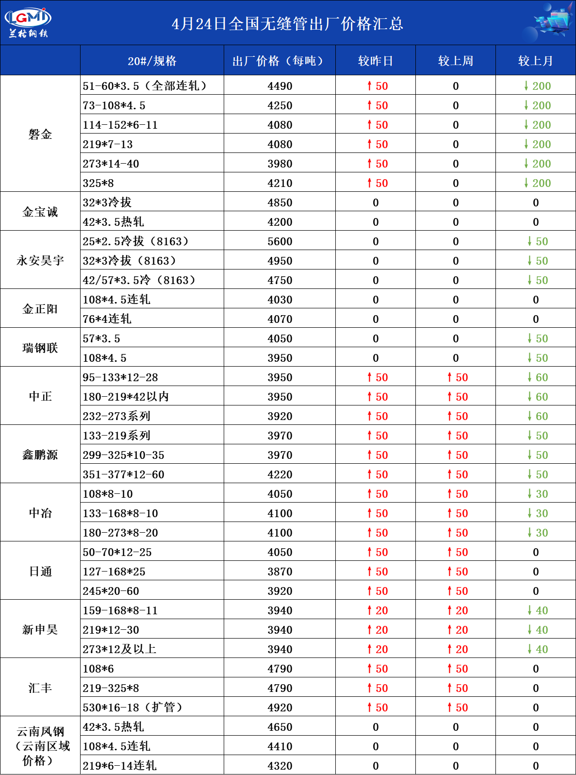 4月24日全国无缝管出厂价格汇总