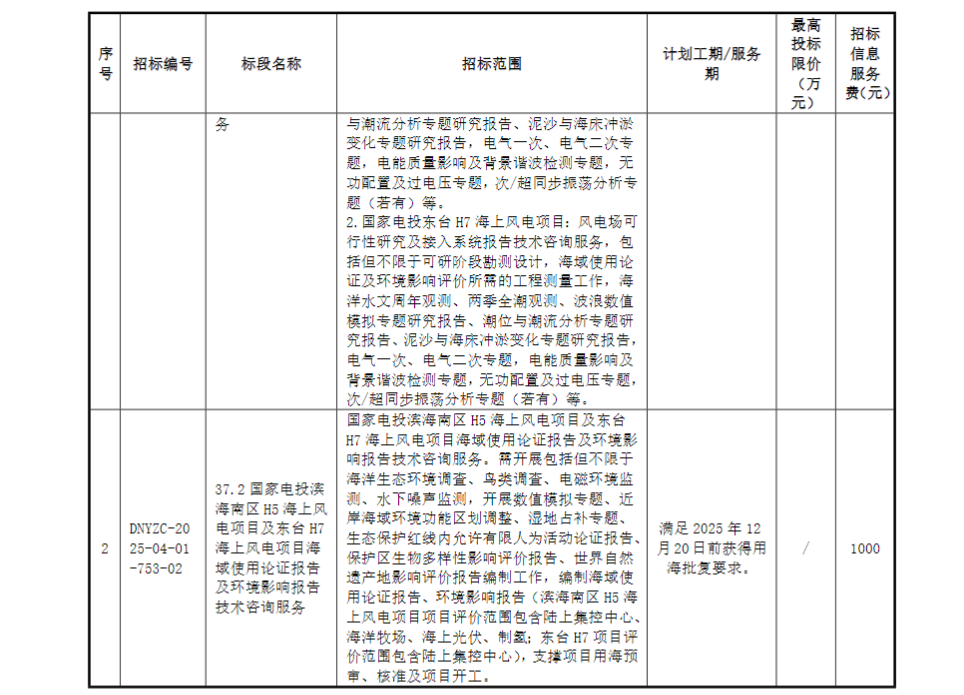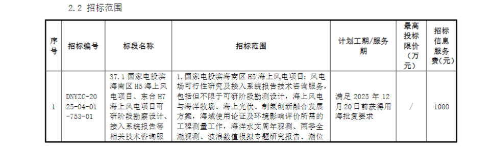 4月22日,国家电投集团江苏电力有限公司2025年第37批招标国家电投滨海南区H5海上风电项目、东台H7海上风电项目可研阶段勘察设计、接入系统报告、海域使用论证报告及环境影响报告技术咨询服务2项目招标。