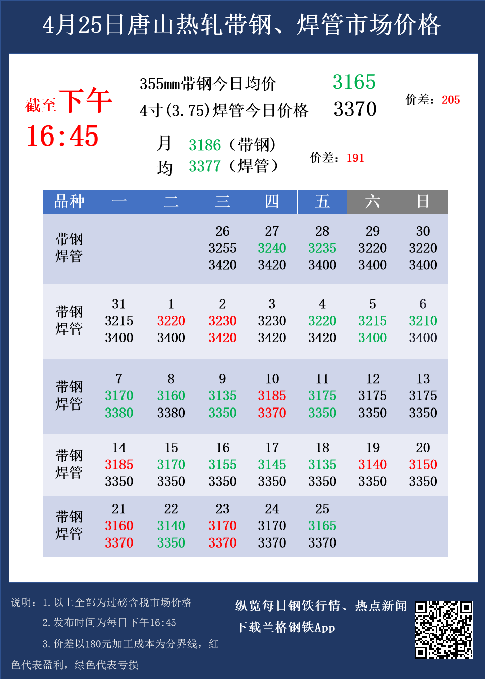 • 4月25日(16:45)唐山热轧带钢与焊管市场成交价格