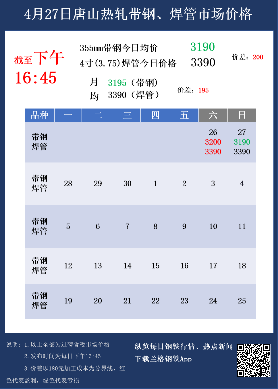 • 4月27日(16:45)唐山热轧带钢与焊管市场成交价格