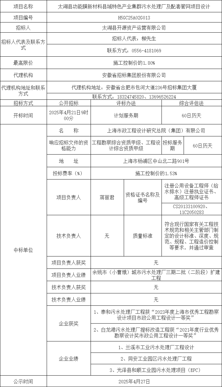 4月27日,太湖县公共资源交易中心发布《太湖县功能膜新材料县域特色产业集群污水处理厂及配套管网项目设计》中标结果公示,中标人为上海市政工程设计研究总院(集团)有限公司。