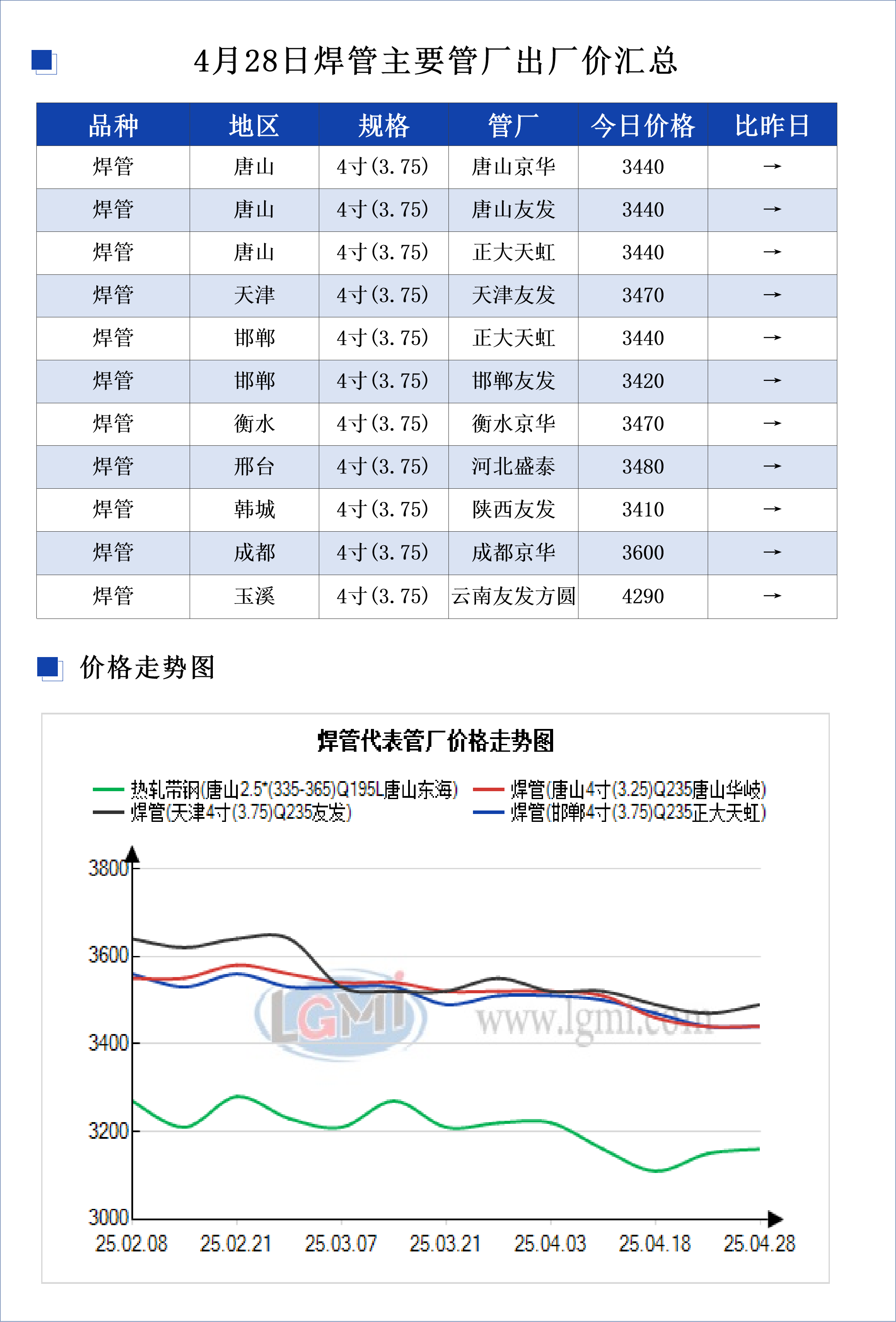 • 4月25日主流焊接钢管及上游品种出厂价汇总