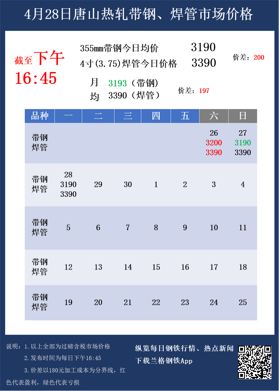• 4月28日(16:45)唐山热轧带钢与焊管市场成交价格