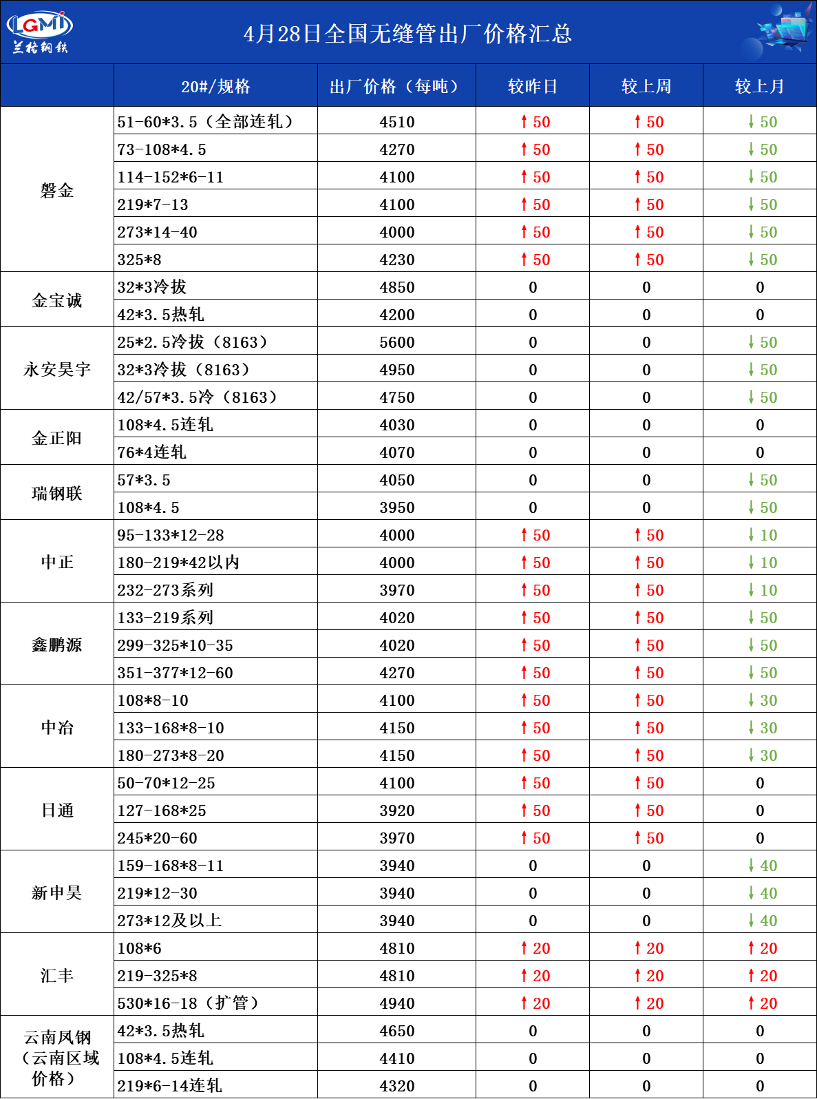 • 4月28日全国无缝管出厂价格汇总