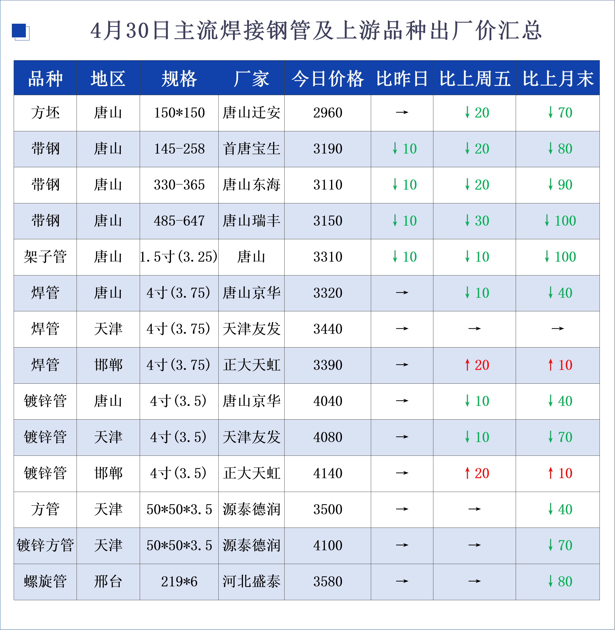 • 4月30日主流焊接钢管及上游品种出厂价汇总