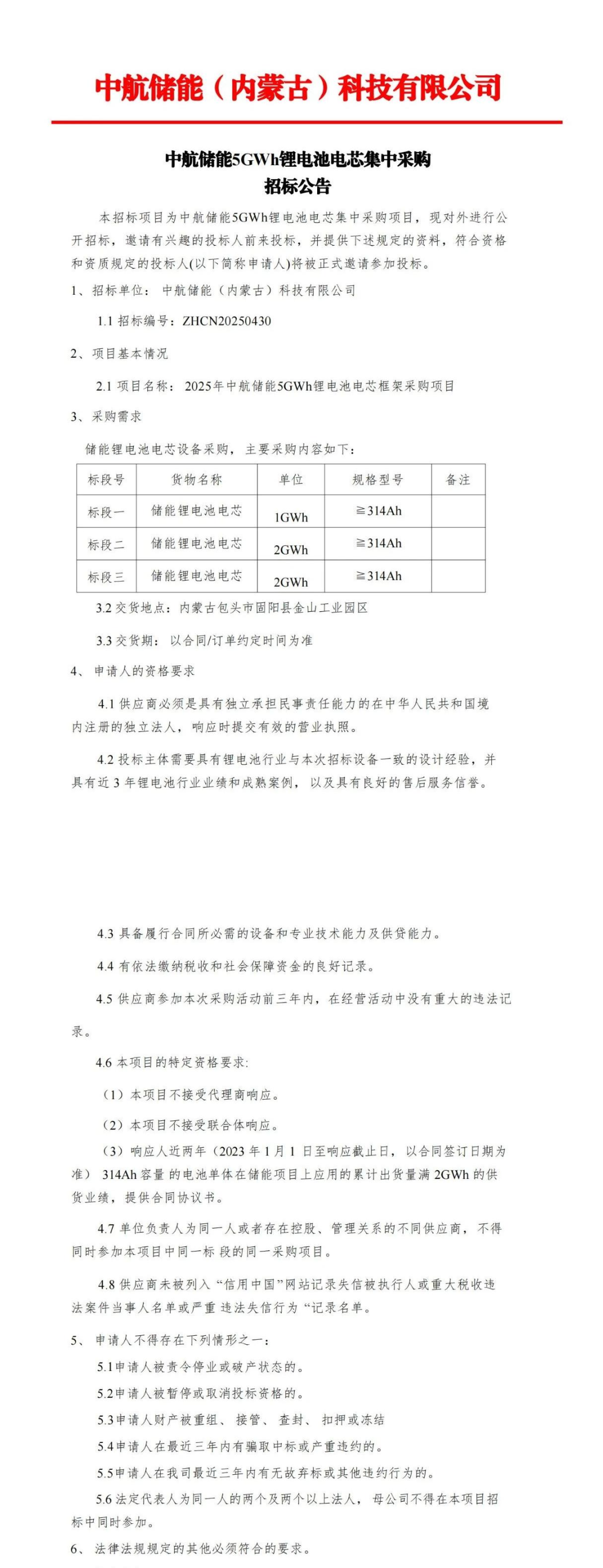 5GWh!内蒙古企业采购≥314Ah储能电芯!
