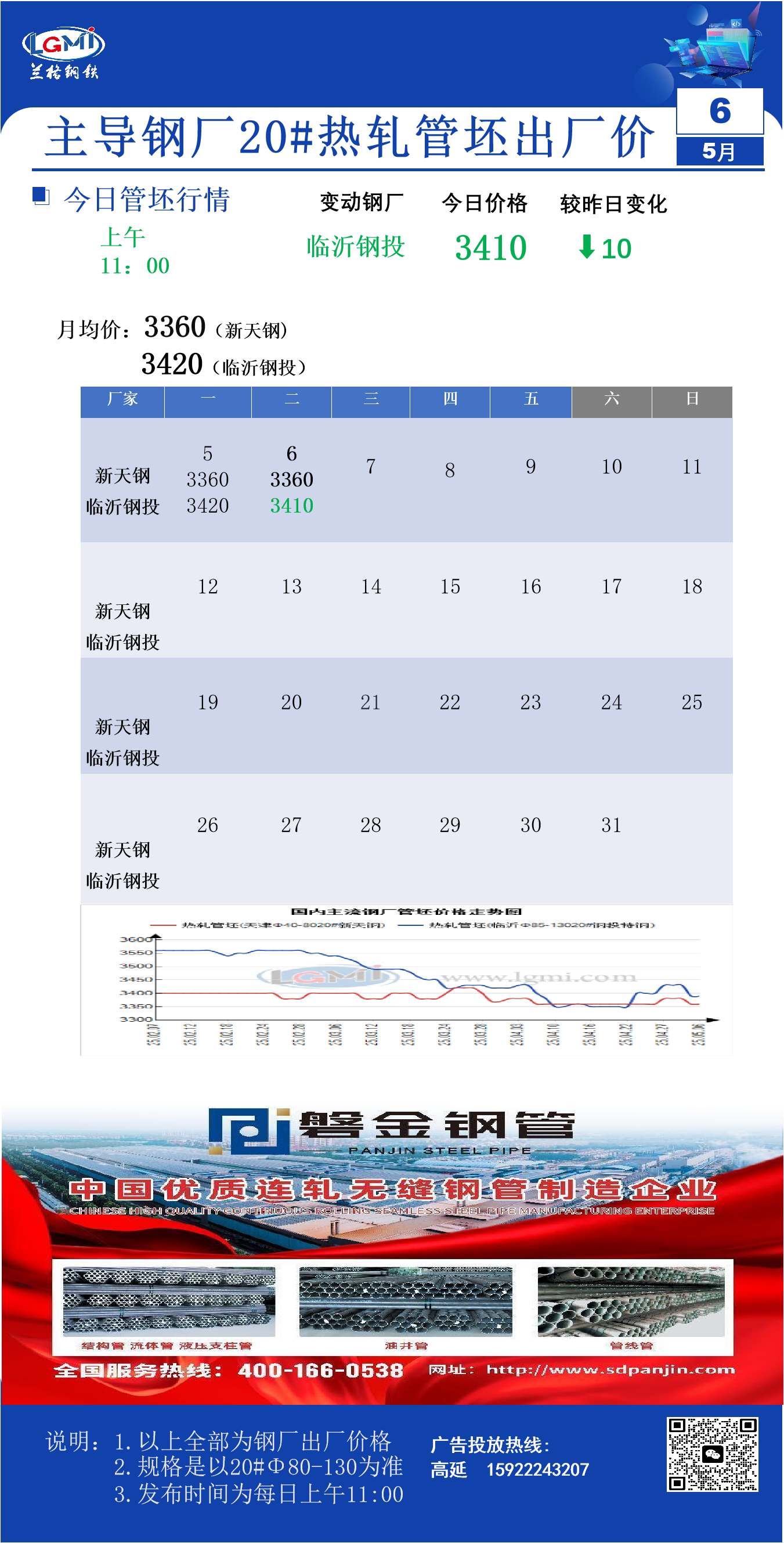 • 5月6日主导钢厂20#热轧管坯出厂价(11:00)