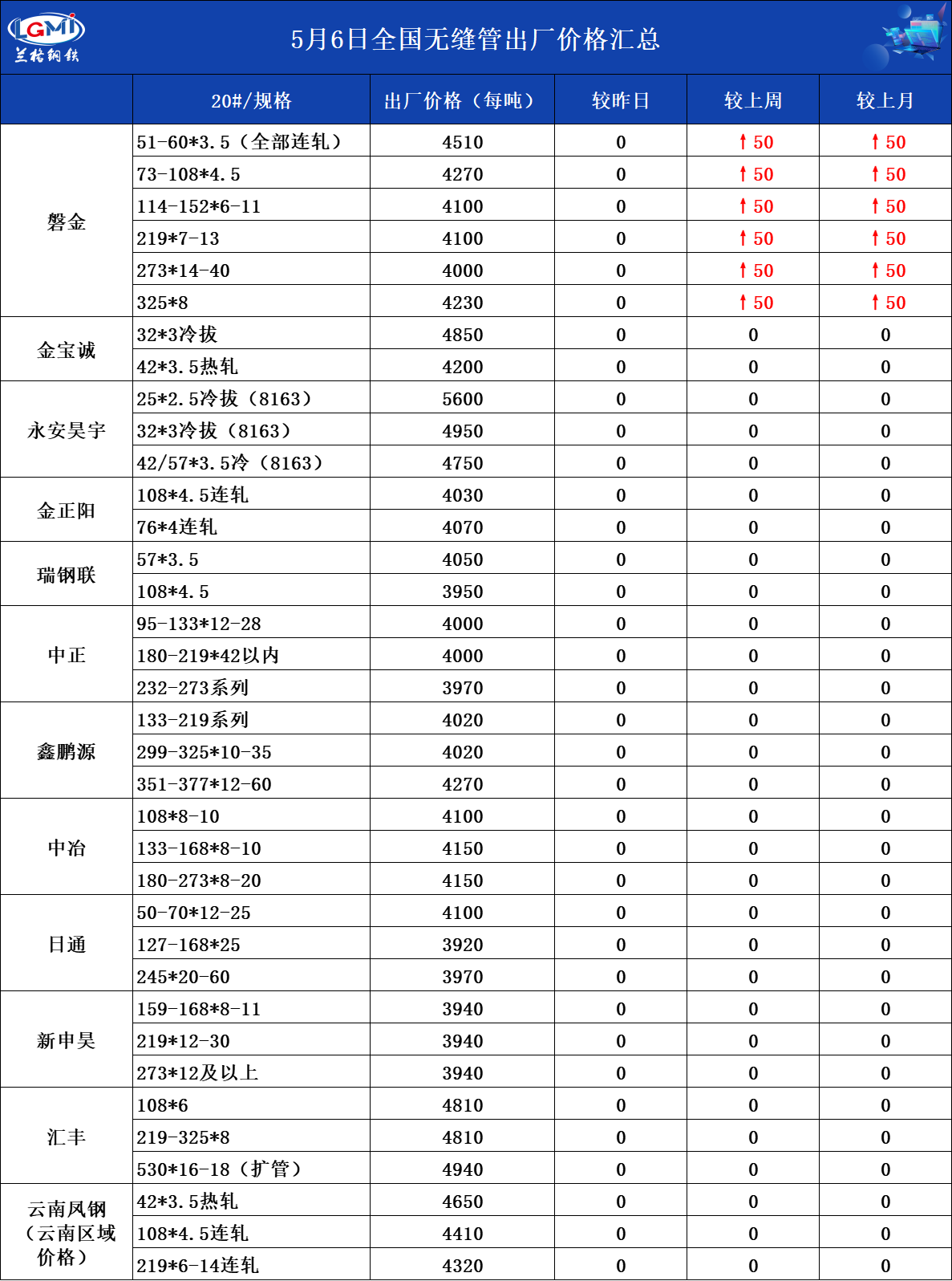 • 5月6日主导钢厂20#热轧管坯出厂价(11:00)