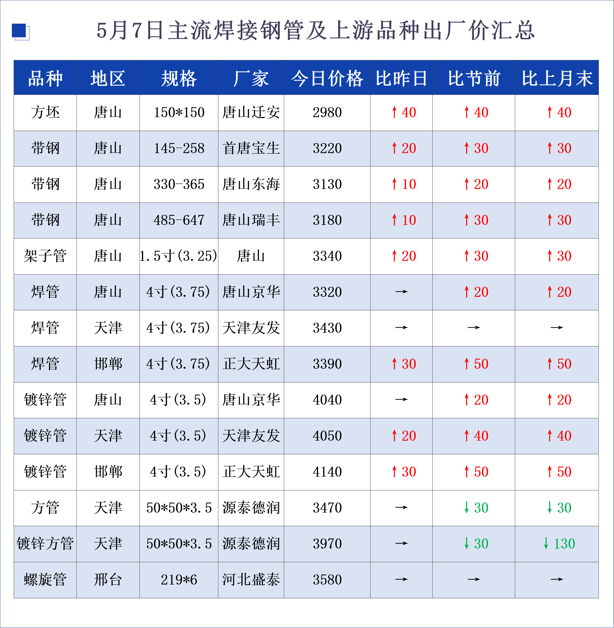 • 5月7日主流焊接钢管及上游品种出厂价汇总