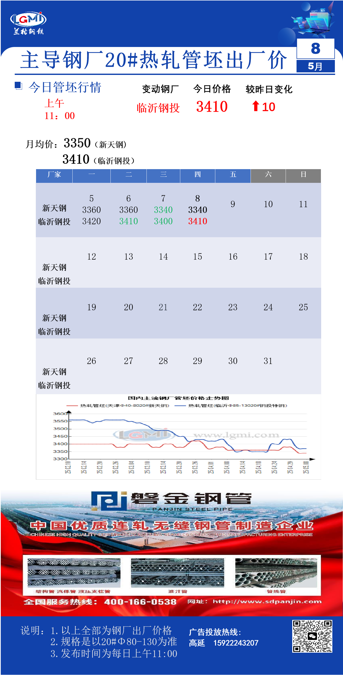 • 5月8日主导钢厂20#热轧管坯出厂价(11:00)