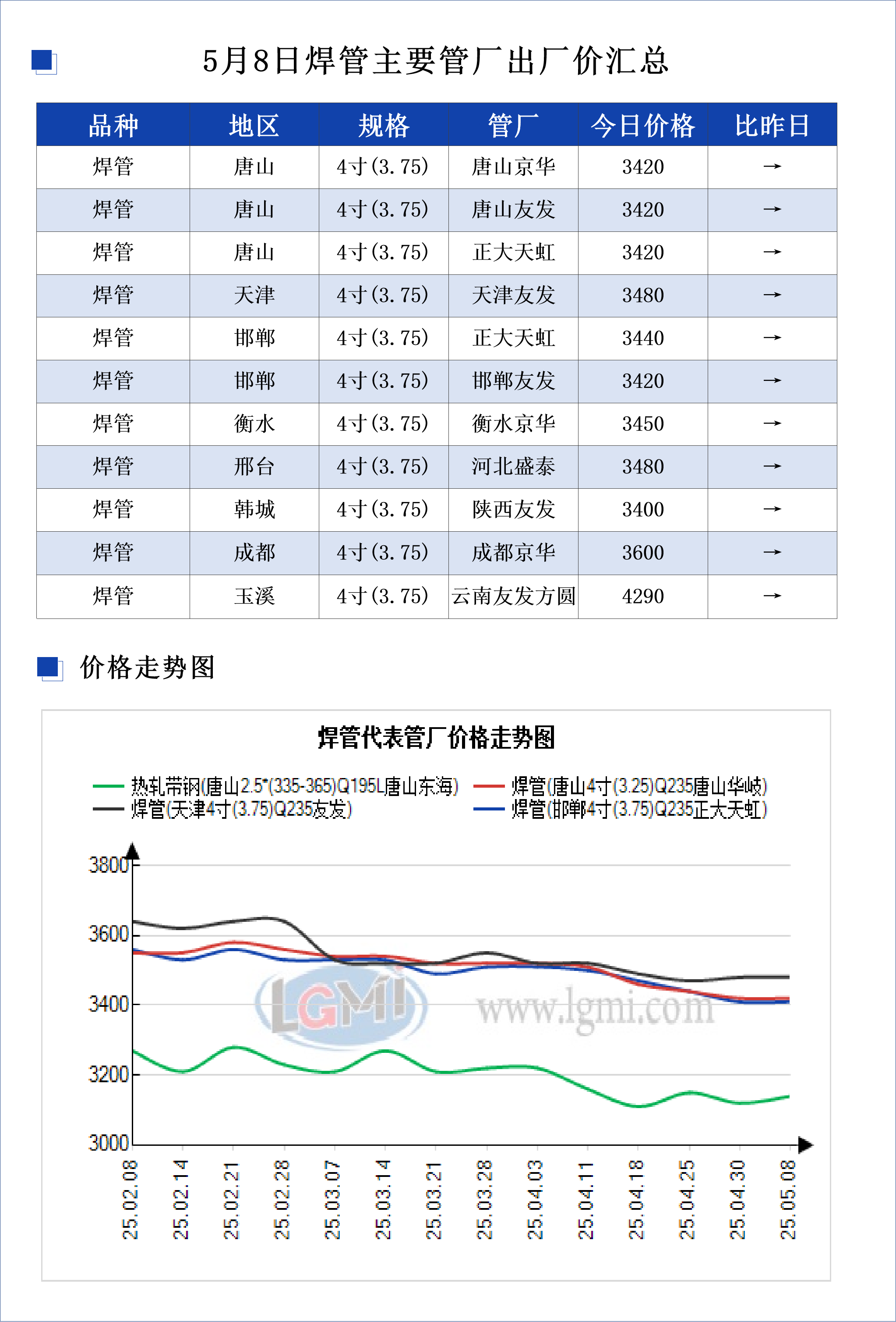 • 5月7日主流焊接钢管及上游品种出厂价汇总