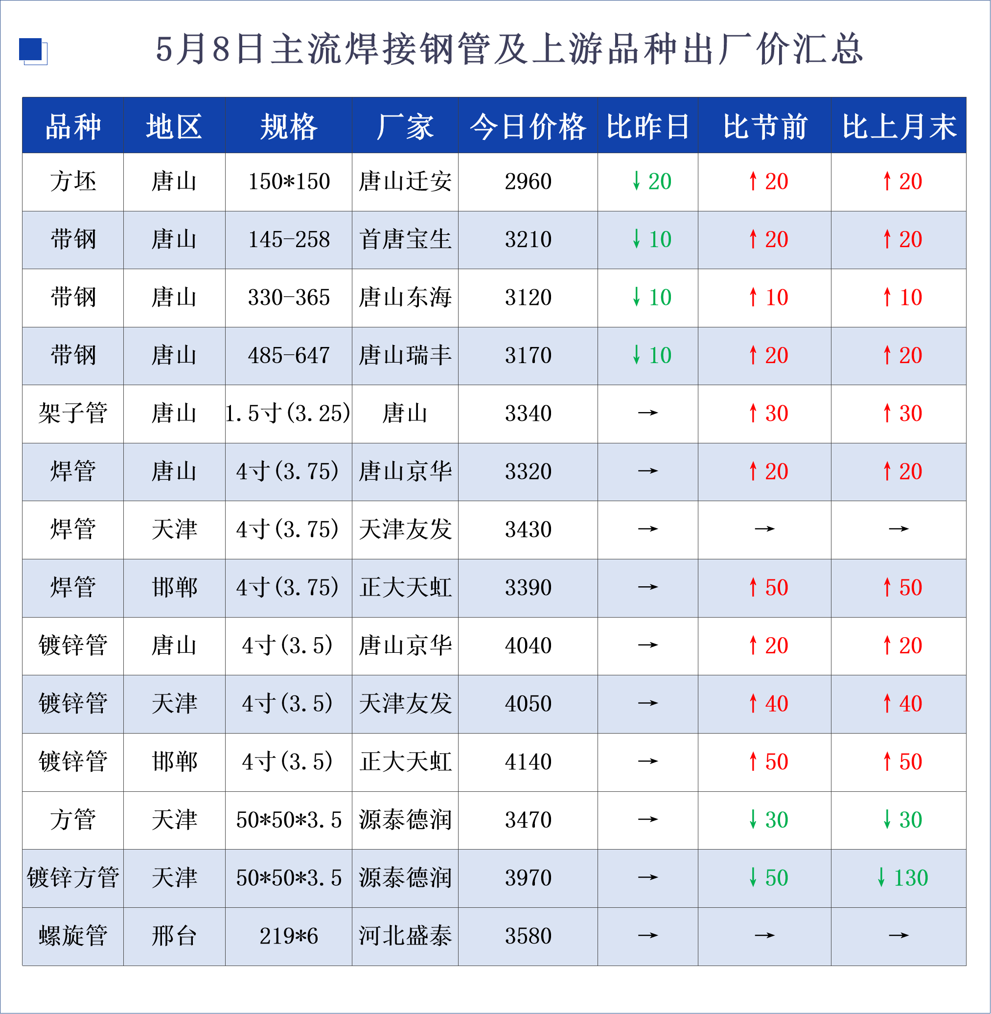 • 5月8日主流焊接钢管及上游品种出厂价汇总