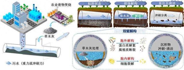 针对上述难题,该团队从污水管道沉积物淤积机理入手,创新性地研发基于草木灰触发碱性解构的沉积物原位自清洁技术与组分分离策略。与能耗或水耗高、效率低的传统机械冲刷和水力淘洗方式相比,该技术可将沉积物清淤分离率提升7倍以上,不仅能够利用重力污水流进行沉积物冲刷清淤,而且可有效分离有机和无机组分,实现无机砂石材料的回收利用。