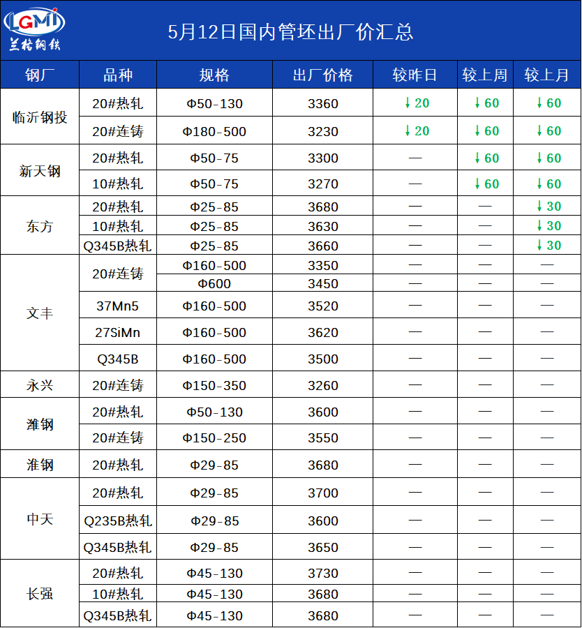 • 5月12日主导钢厂20#热轧管坯出厂价(11:00)