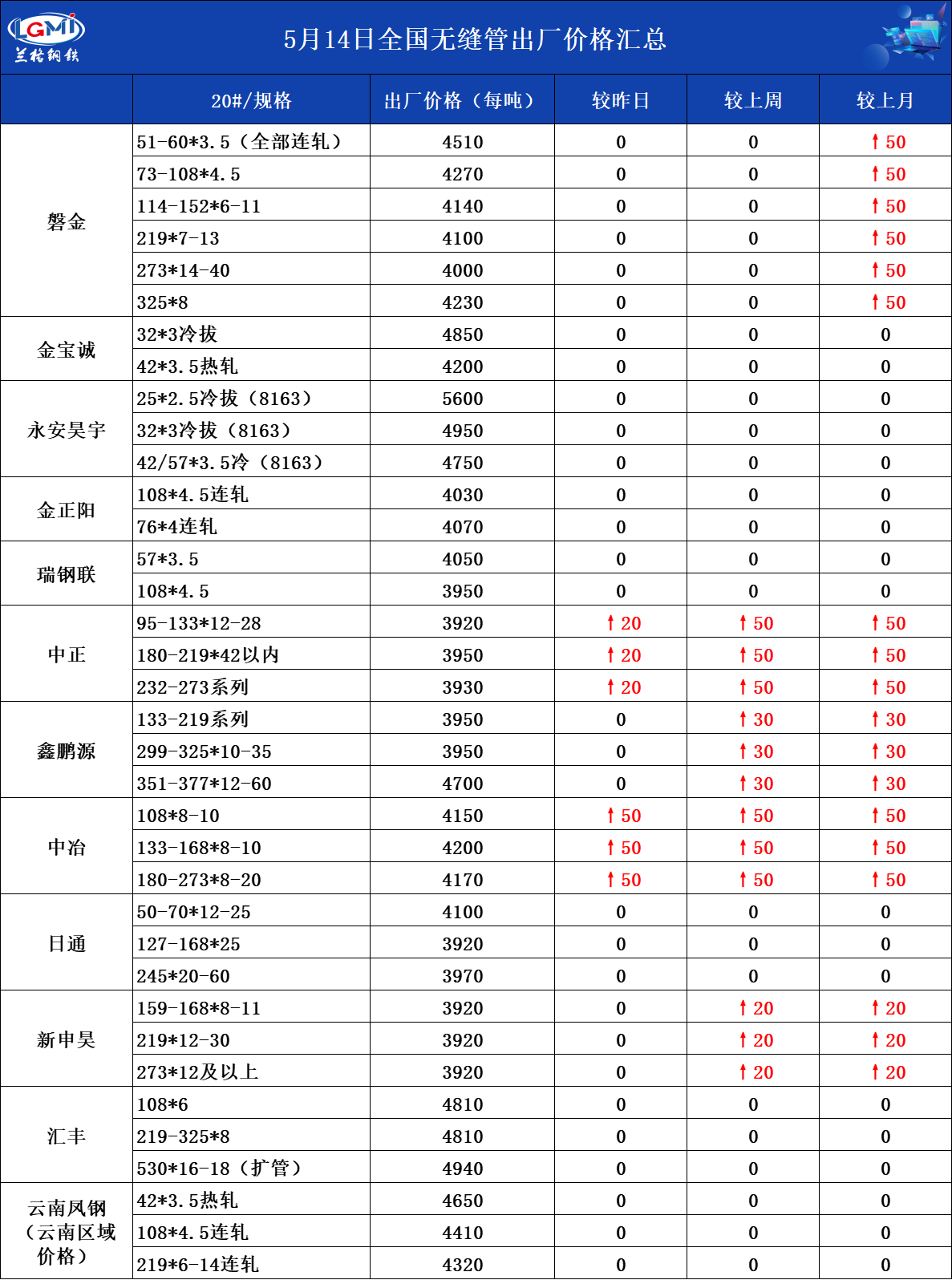 • 5月13日主导钢厂20#热轧管坯出厂价(11:00)