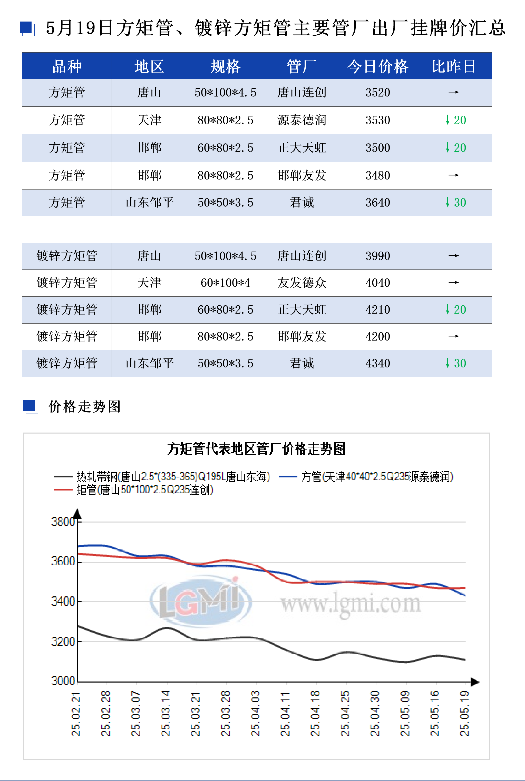 • 5月19日方矩管、镀锌方矩管主要管厂出厂挂牌价汇总