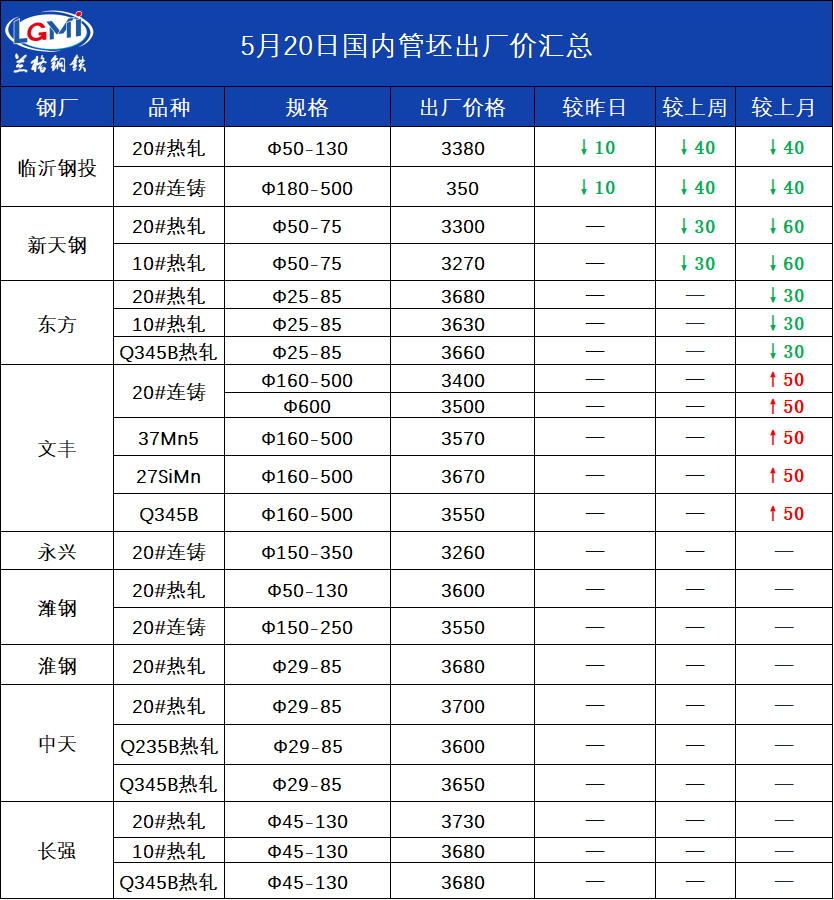 • 5月20日国内管坯出厂价汇总