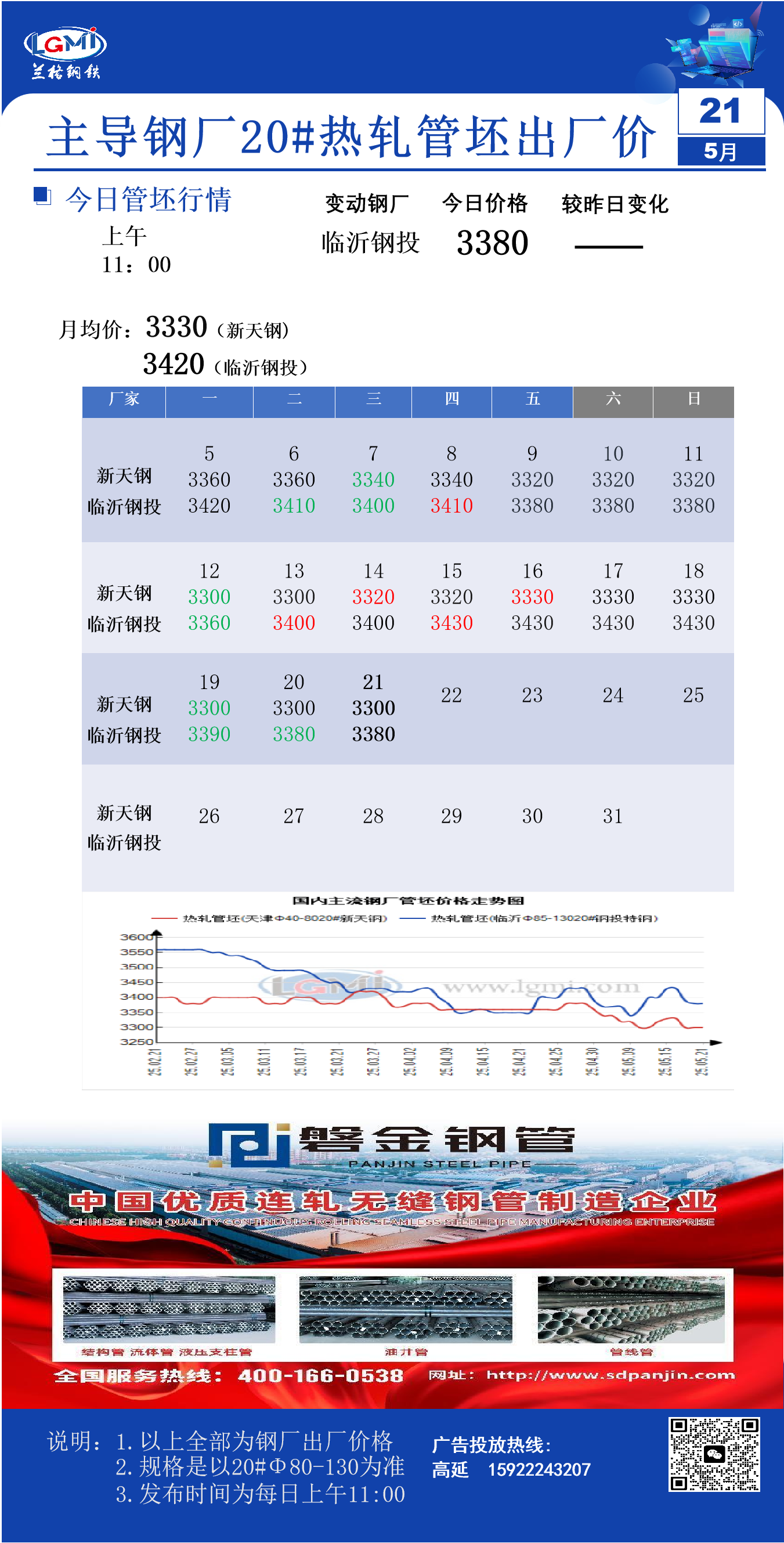 • 5月21日主导钢厂20#热轧管坯出厂价(11:00)