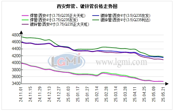 今日西安焊接钢管价格主稳个调,成交一般。兰格钢铁云商平台监测数据显示,截至2025年5月21日,西安焊接钢管价格:4寸(3.75)焊管过磅含税价:西安友发报价3470元(吨价,下同),正大报3470元,比上一个交易日价格持平;4寸(3.75) 镀锌管过磅含税价:西安友发报价4150元,利达报价4170元,正大报价4090元,比上个一个交易日价格跌20元。