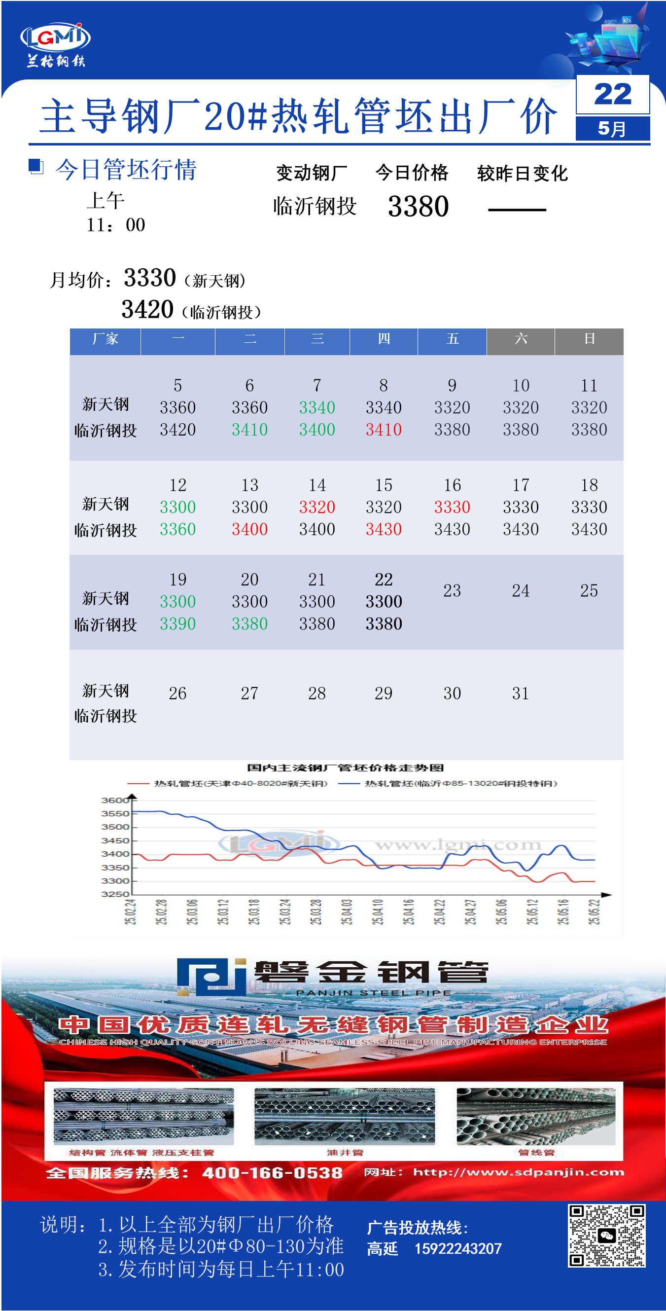 • 5月22日主导钢厂20#热轧管坯出厂价(11:00)