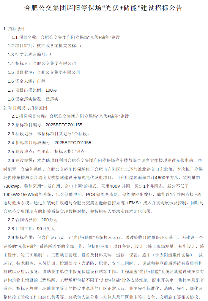 5月22日,合肥公交集团庐阳停保场“光伏+储能”建设招标公告发布。招标人为合肥公交集团有限公司,资金来源为自筹。