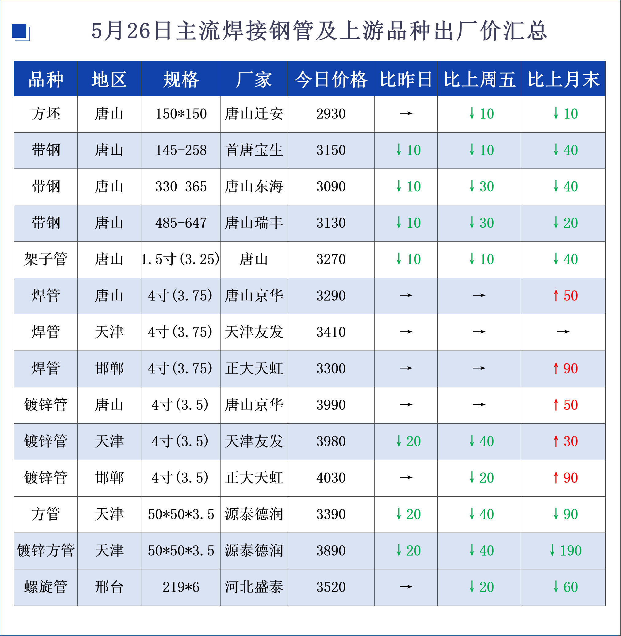• 5月26日主流焊接钢管及上游品种出厂价汇总
