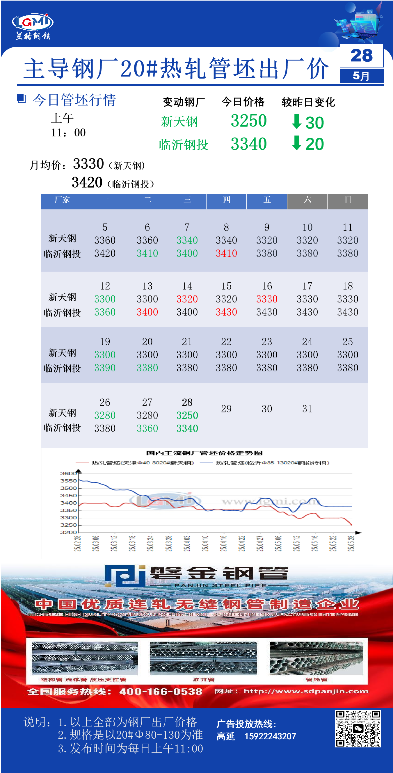• 5月28日主导钢厂20#热轧管坯出厂价(11:00)