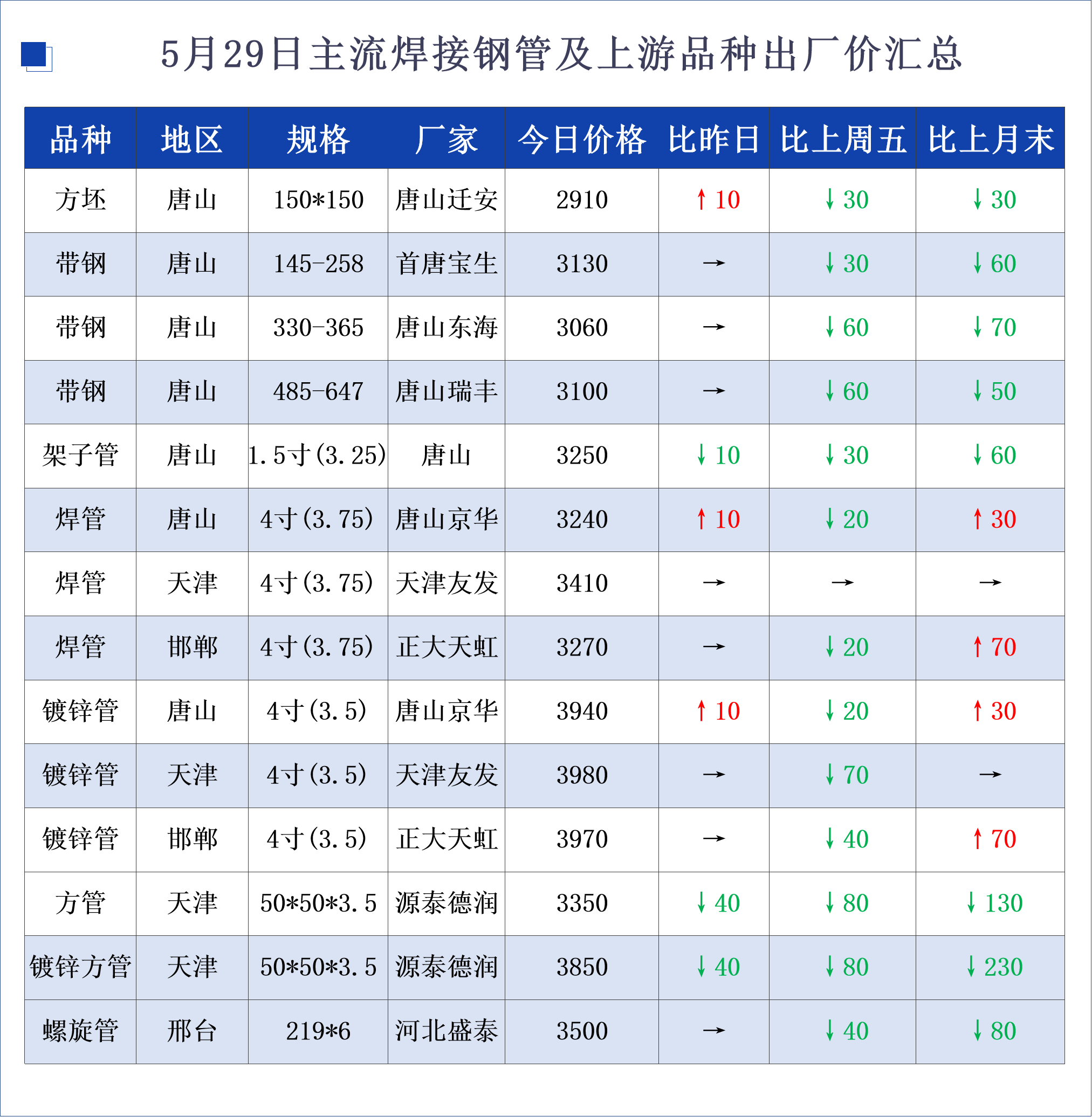 • 5月29日主流焊接钢管及上游品种出厂价汇总