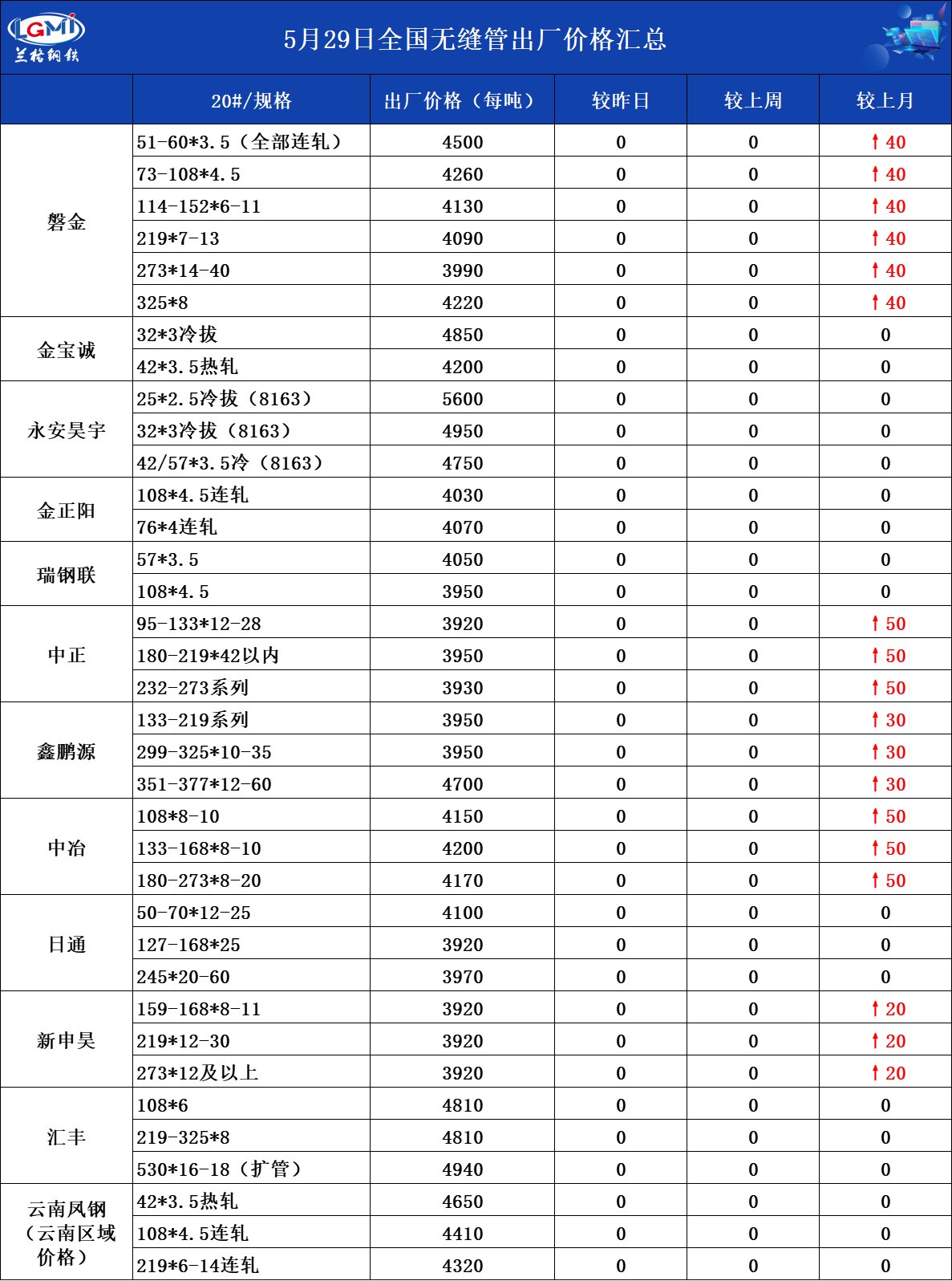 • 5月29日主导钢厂20#热轧管坯出厂价(11:00)