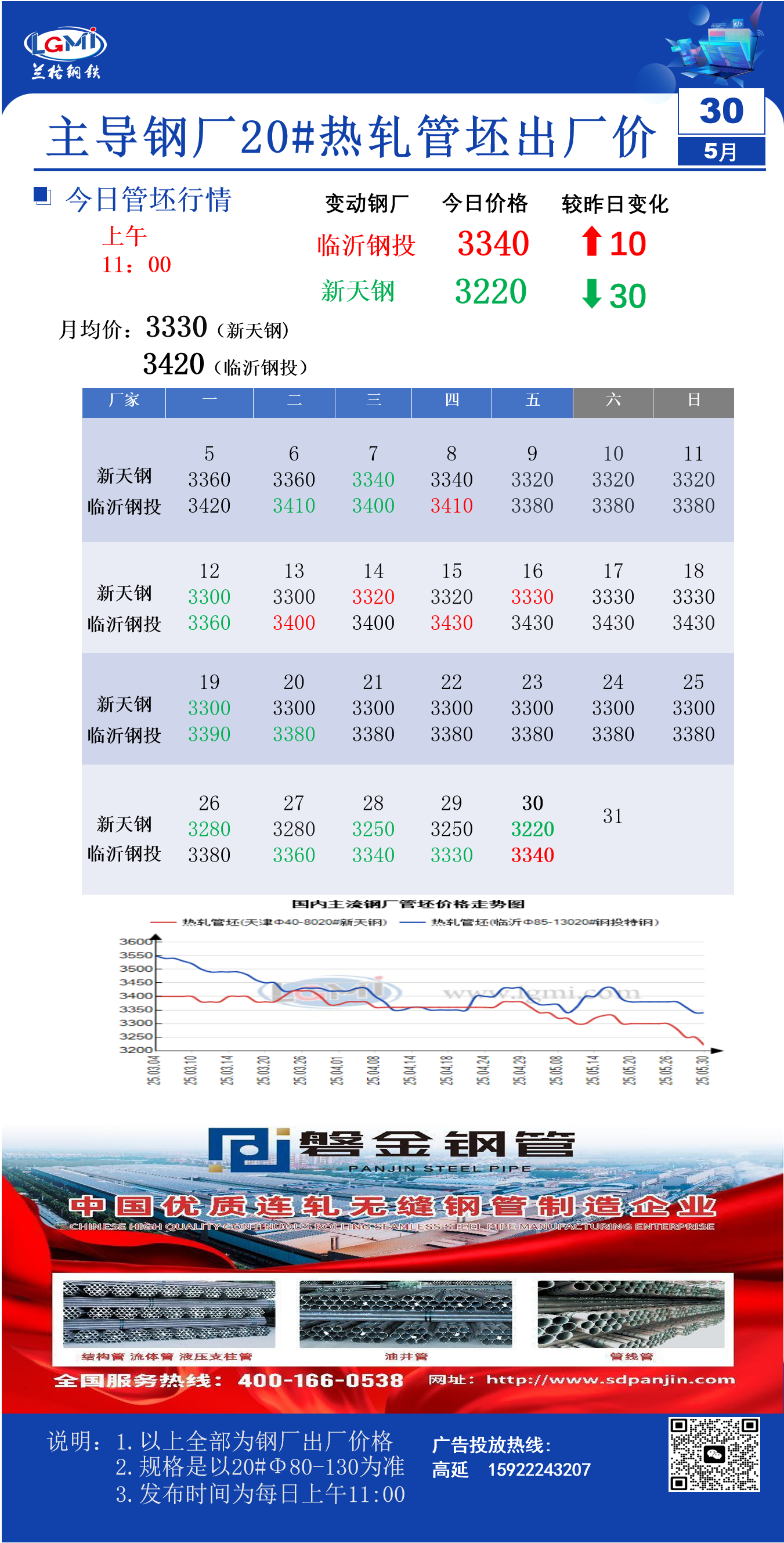 • 5月30日主导钢厂20#热轧管坯出厂价(11:00)