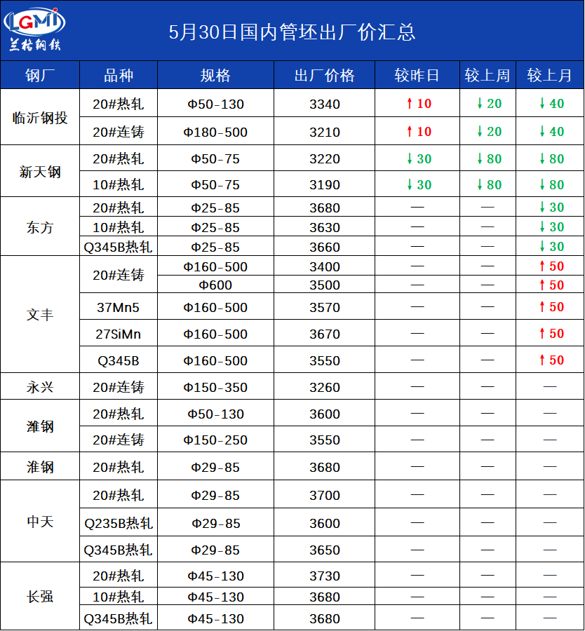 • 5月30日主导钢厂20#热轧管坯出厂价(11:00)