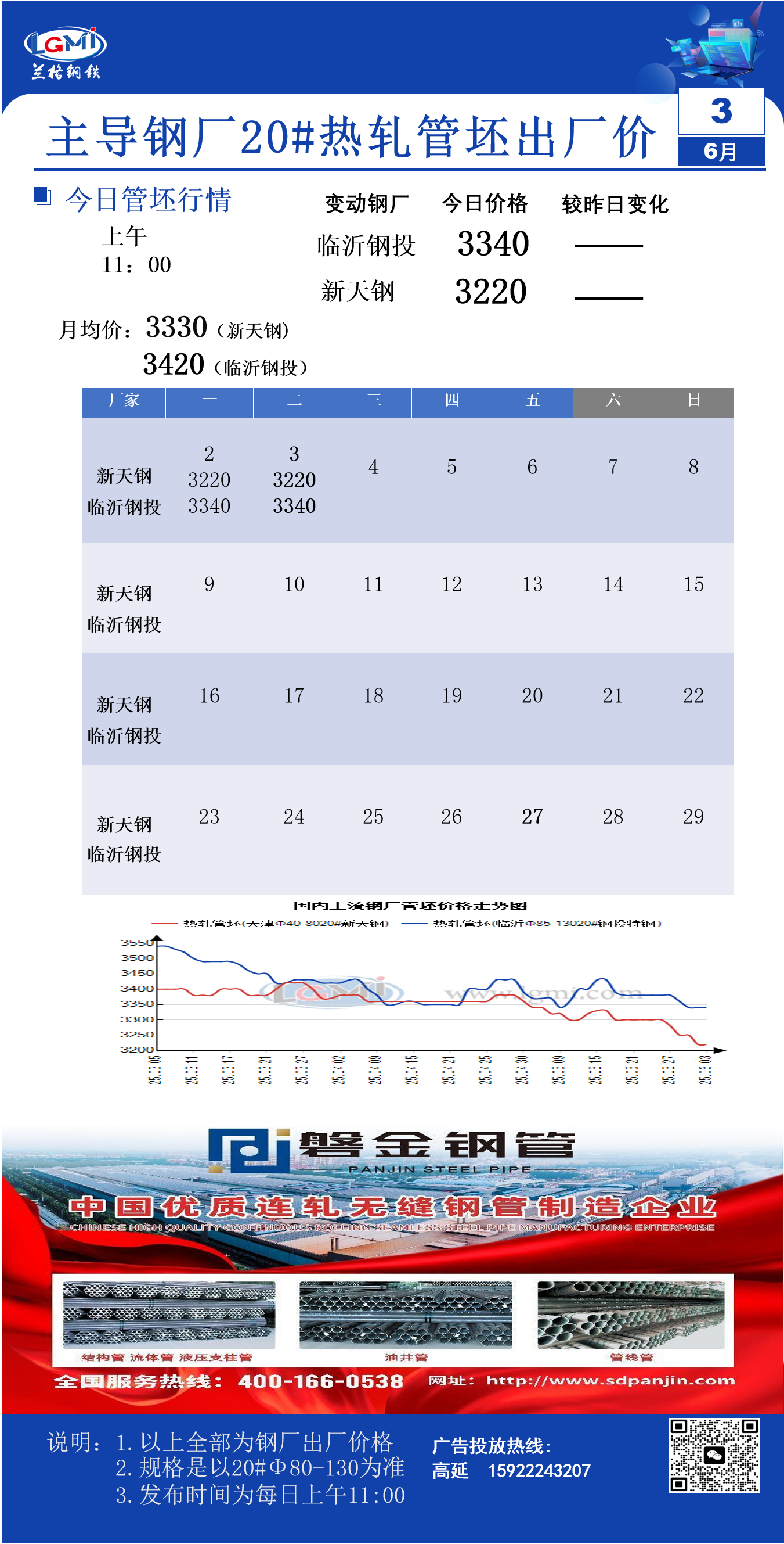• 6月3日主导钢厂20#热轧管坯出厂价(11:00)