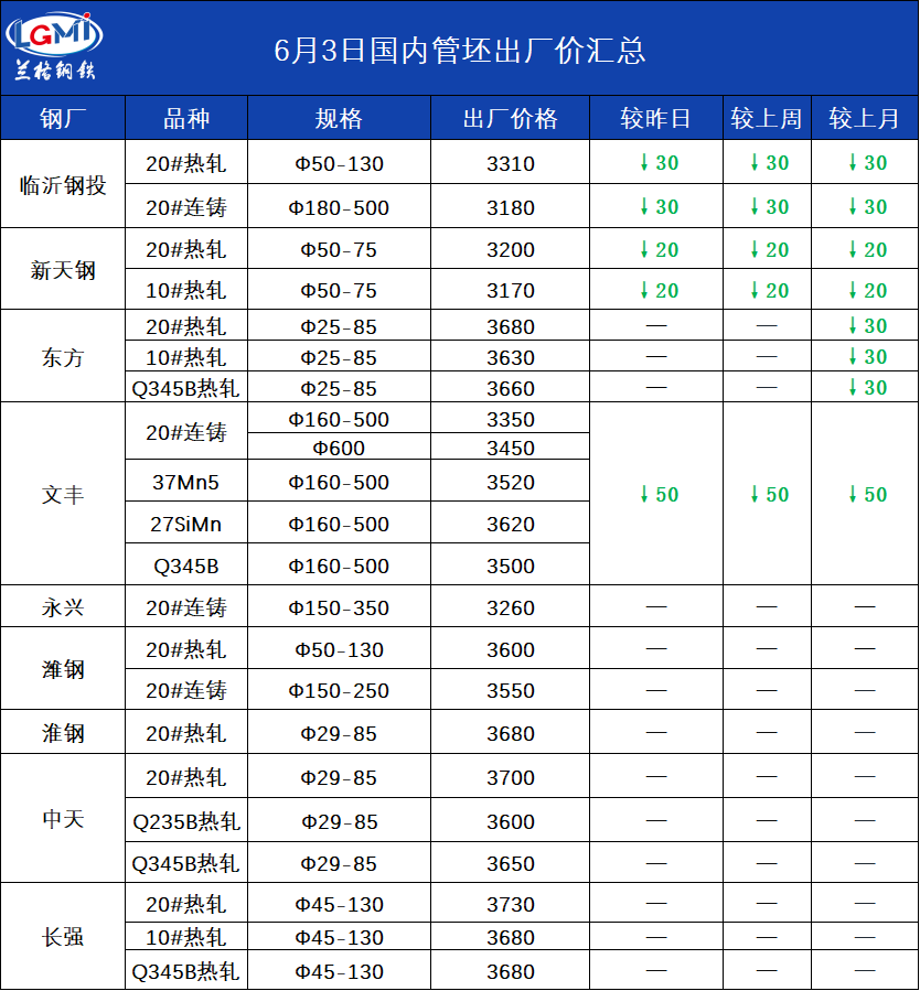 • 6月3日主导钢厂20#热轧管坯出厂价(11:00)